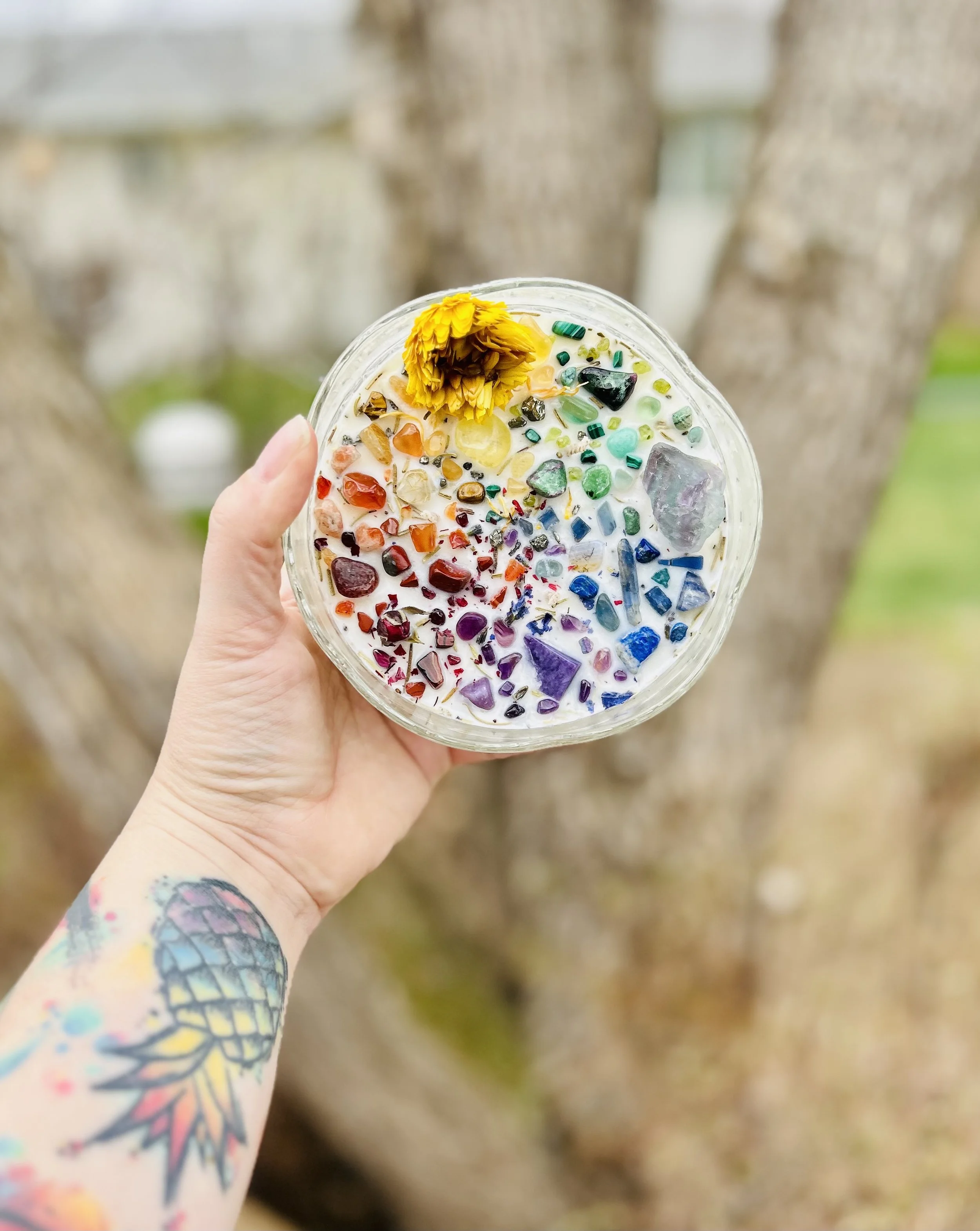 All candles are poured by hand in small batches and infused with carefully selected crystals, flowers, and herbs.