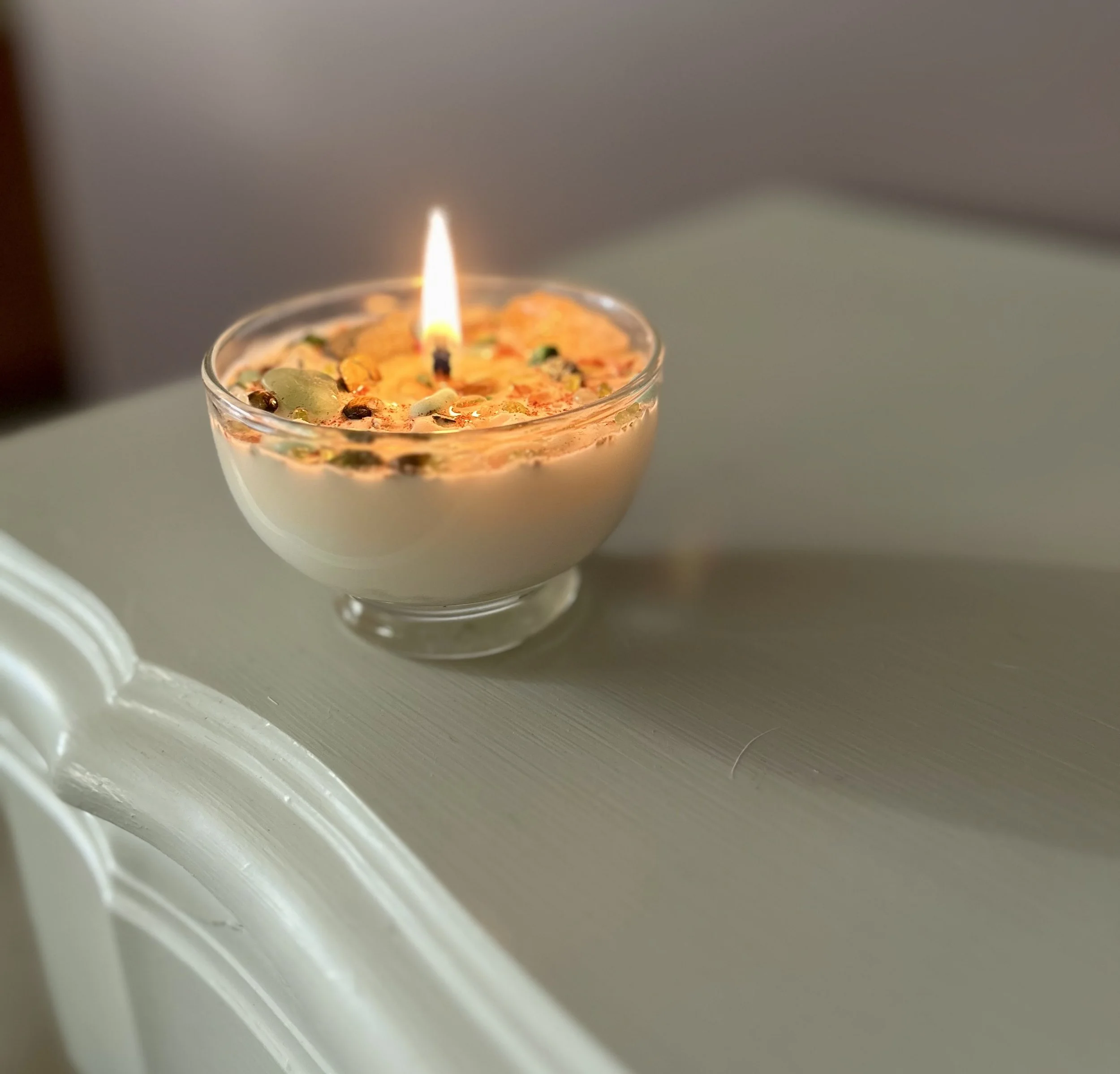 Each candle is lovingly infused with positive energy and natural ingredients. The vessels are thoughtfully repurposed, making each piece truly unique. The careful selection of crystals, herbs, and flowers not only promotes well-being but also supports an eco-friendly lifestyle, adding a personal and meaningful touch to any atmosphere.